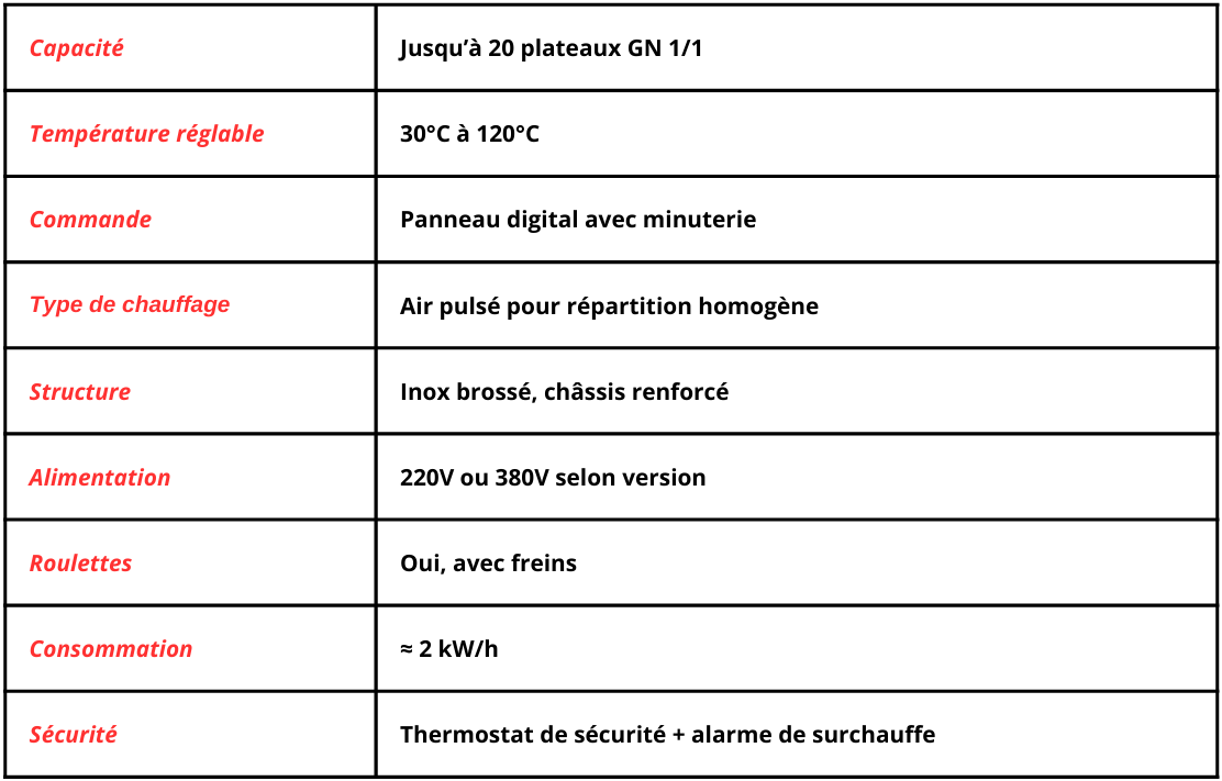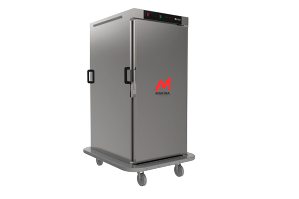 Armoire chauffante professionnelle avec chariots à plateaux amovibles, utilisée pour le stockage temporaire de produits cuits ou sensibles à la température avant l’emballage ou la distribution