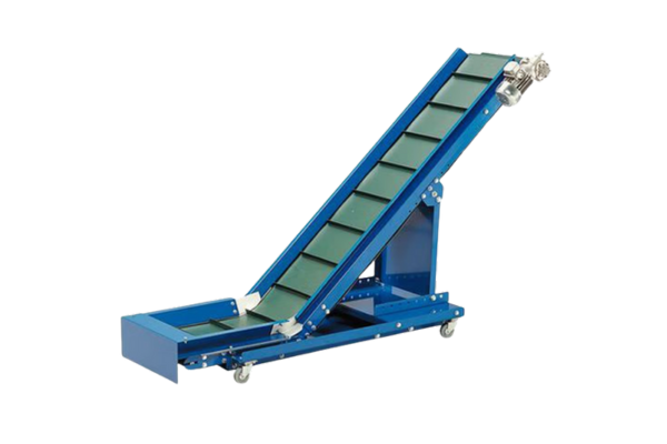Convoyeur incliné permettant de transporter les produits vers un niveau supérieur ou inférieur. Utilisé pour alimenter des machines ou relier deux niveaux