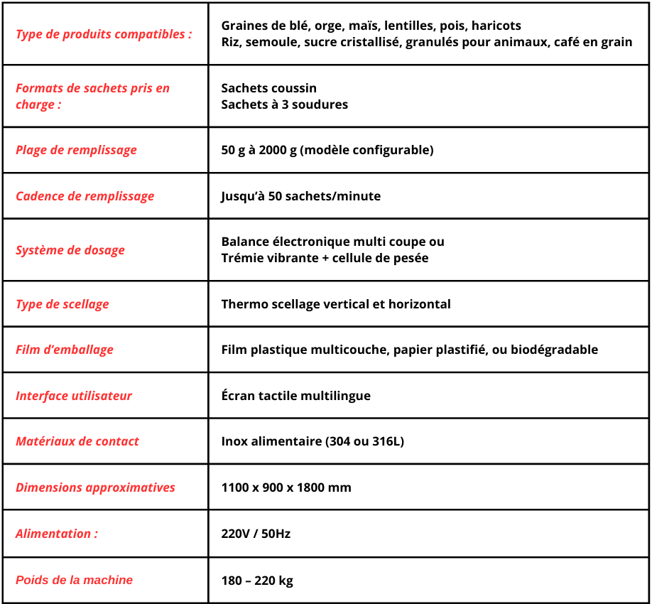 Machine automatique adaptée au conditionnement de graines et produits secs en vrac dans des sachets plastiques. Elle offre une précision de pesée, une grande vitesse de remplissage, et un scellage propre, adaptée à une variété de graines et de grains
