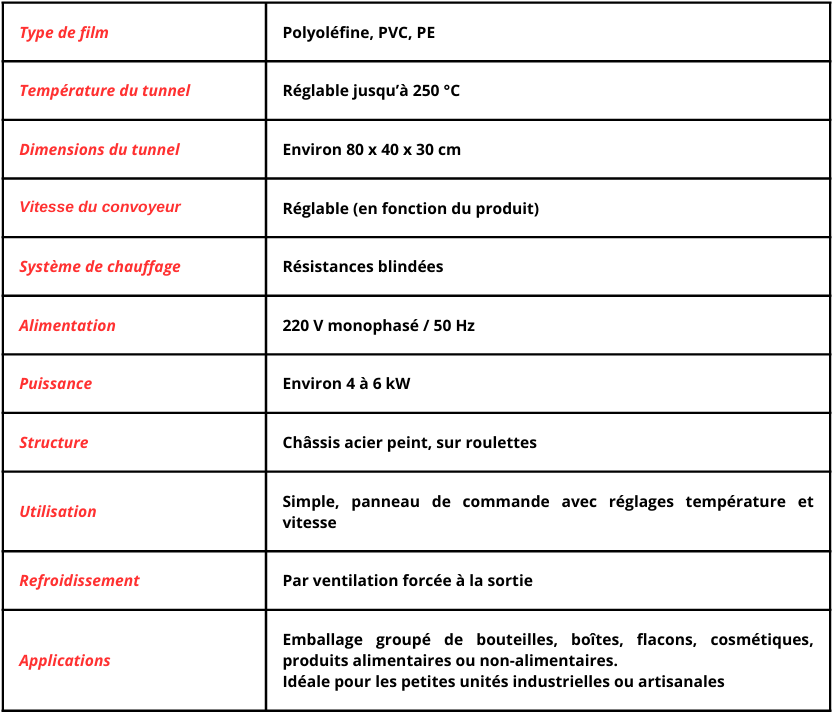 Cette fardeleuse compacte est conçue pour l’emballage par film rétractable de petits lots de produits. Elle intègre un tunnel de rétraction chauffé pour assurer un emballage uniforme, solide et esthétique