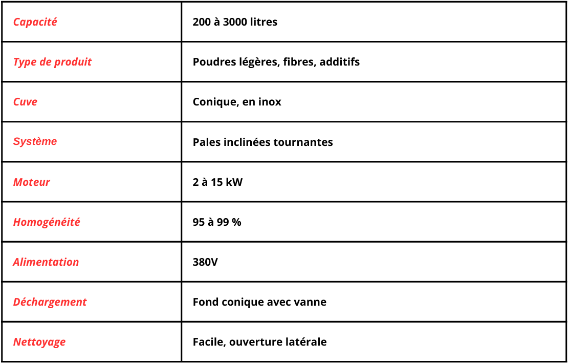 Utilisé pour mélanger des poudres sèches de manière homogène. Idéal pour l’agroalimentaire, les produits chimiques ou cosmétiques