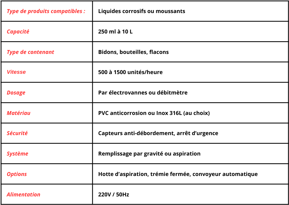 Machine conçue pour le remplissage sécurisé de produits chimiques comme l’eau de javel, les acides, solvants ou détergents industriels